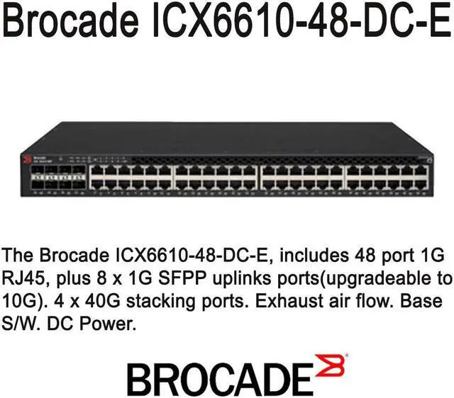 Brocade ICX 6610-48 - Switch - L3 - managed - 48 x 10/100/1000 + 8 x 1 Gigabit Ethernet SFP+ (10 Gigabit Ethernet Ports On Demand) - rack-mountable - DC power Today's enterprise campus networks are expected to deliver services thought impossible just a few years ago. High-Definition (HD) video conferencing, real-time collaboration, Unified Communications (UC), and Virtual Desktop Infrastructure (VDI) are only a few of the applications that organizations are deploying to enhance employee productivity, improve customer service, and create a competitive advantage. These same networks must also provide anytime, anywhere mobile access and scale to meet rising user expectations. At the same time, organizations face continued pressure to reduce costs and do more with less. More than ever, campus networks need to quickly and efficiently evolve with the ever-changing business environment.The Brocade ICX 6610 helps organizations meet this challenge by delivering wire-speed, non-blocking performance across all ports to support latency-sensitive applications such as real-time voice and video streaming and VDI. Brocade ICX 6610 switches can be stacked using four full-duplex 40 Gbps stacking ports that provide an unprecedented 320 Gbps of backplane stacking bandwidth with full redundancy, eliminating inter-switch bottlenecks.Product Description: Brocade ICX 6610-48 - switch - 48 ports - managed - rack-mountableDevice Type: Switch - 48 ports - L3 - managed - stackableEnclosure Type: Rack-mountable 1USubtype: Gigabit EthernetPorts: 48 x 10/100/1000 + 8 x 1 Gigabit Ethernet SFP+ (10 Gigabit Ethernet Ports On Demand)Performance: Switching capacity : 576 Gbps Forwarding performance : 432 Mbps Stacking bandwidth : 320 GbpsCapacity: Virtual interfaces (VLANs) : 4096 Spanning Tree Protocol instances : 254MAC Address Table Size: 32000