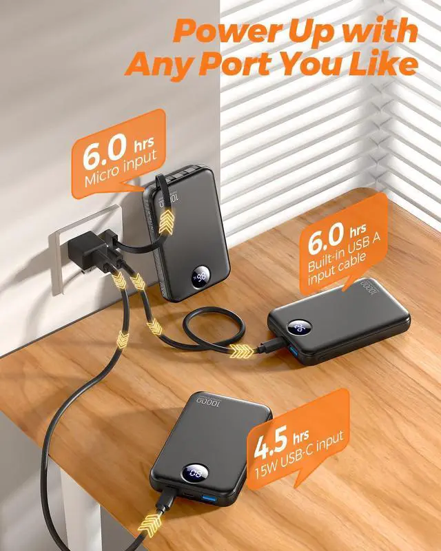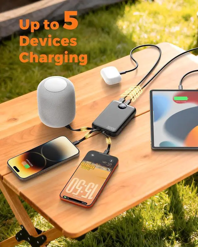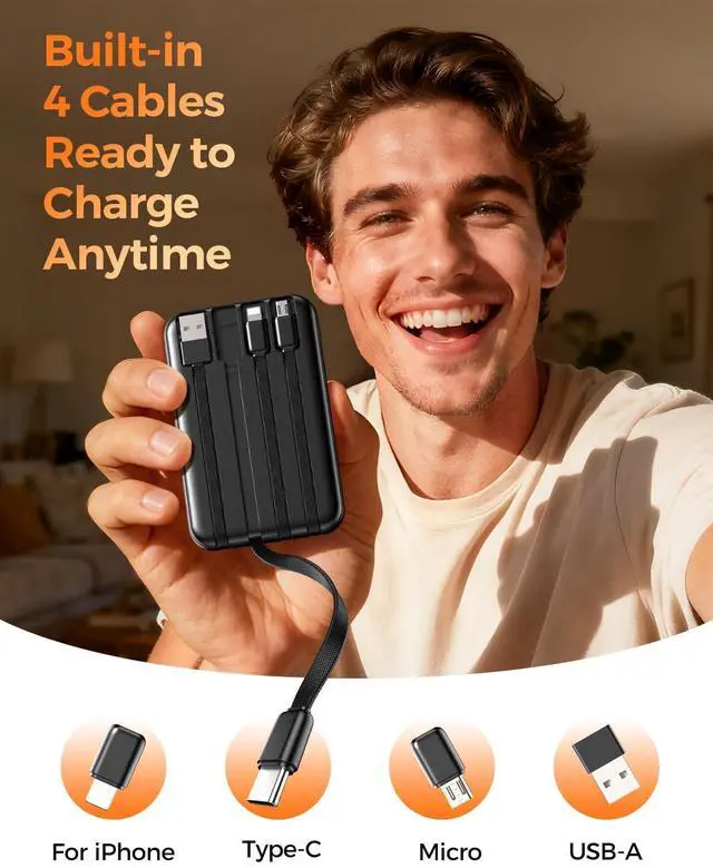 Tired of carrying different charging cables for every device? This 10000mAh all-in-one portable charger is designed to simplify your daily routine with true cable-free convenience. Built with four integrated cables and multiple input/output options, it eliminates the need for extra cords while keeping all your devices powered wherever you go. Whether you're commuting, traveling, attending events, or managing a busy day, youll always have the right connection ready. The built-in cable system is engineered for maximum flexibility. It includes a USB-C output cable for modern Android phones and tablets, a Lightning output cable for compatible devices such as phones and earbuds, a Micro-USB output cable for older electronics and accessories, and a dedicated USB-A input cable that allows you to recharge the power bank itself without carrying additional cords. Simply pull out the cable you needno tangles, no adapters, no extra bulk. With three built-in output cables plus two additional output ports (USB-C and USB-A), this portable charger supports charging up to five devices at the same time. Its ideal for multi-device users, families, travel sharing, conferences, outdoor activities, and emergency backup situations. Phones, tablets, earbuds, small gadgets, and accessories can all be powered simultaneously from one compact unit. Recharging the power bank is just as convenient. The USB-C port functions as both input and output, the Micro-USB port offers an additional input option, and the integrated USB-A input cable gives you a direct recharge method without needing to pack another cable. No matter where you are, you always have multiple ways to power it back up. Despite its powerful 10000mAh capacity, the slim and lightweight design makes it easy to carry in pockets, handbags, crossbody bags, backpacks, or travel cases. Its built for commuting, flights, business trips, festivals, road trips, and everyday emergency backupdelivering reliable power without adding extra weight. Wide compatibility ensures seamless charging for USB-C, Lightning, and Micro-USB devices, including smartphones, tablets, earbuds, portable speakers, fans, and other USB-powered electronics. Everything connects directly through the built-in cables for effortless use. A clear digital LED display shows the exact remaining battery percentage from 0100%, so you always know how much power is available. Advanced safety featuresincluding over-current protection, over-voltage protection, over-charge protection, short-circuit protection, and temperature controlhelp ensure stable and secure charging performance for both the power bank and your devices. Compact, versatile, and travel-ready, this all-in-one 10000mAh portable charger is built to keep you connected anytime, anywhere. One slim power bankno extra cables, no limitations, no guesswork.