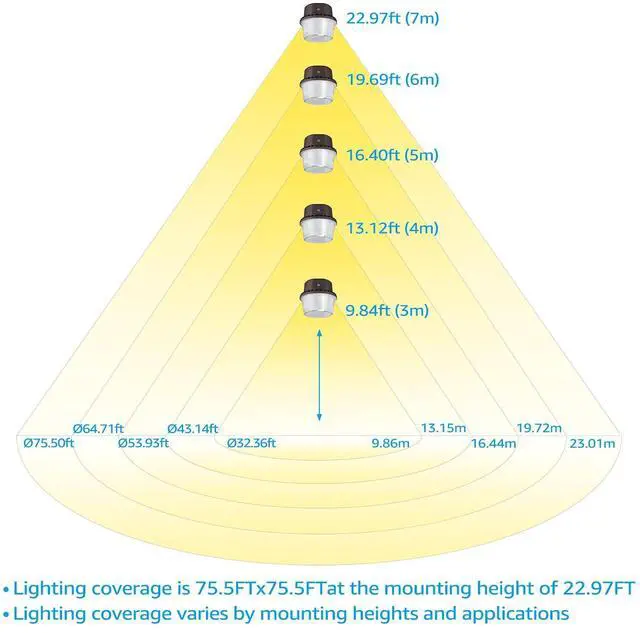 There is a dusk-to-dawn photocell included, which make the light auto-on in nighttime and auto-off in daytime. The light has 4200 lumens high outputs and instant on with 120° wide beam angle floodlight, which can cover 32.36ft x 32.36ft large light area when mounted at 9.84 feet. Besides, the light is easy and fast installation. It has multiple installation method by wall or post mounted and compatible with mounting arms.
