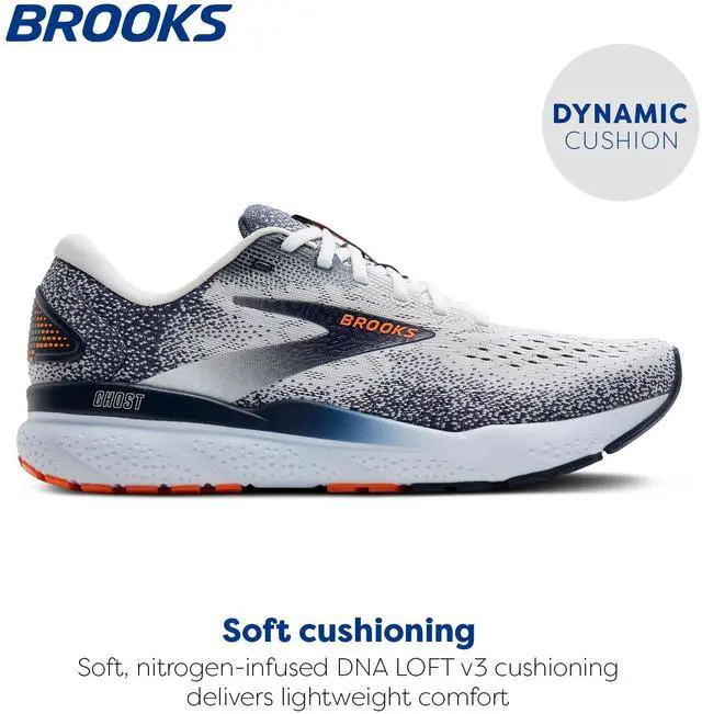 THIS MENS SHOE IS FOR: Runners looking for a smooth ride that wont distract from the fun of the run. The Ghost 16 offers a refined 3D Fit Print to create a more seamless, secure fit. This Brooks Ghost 16 is a certified PDAC A5500 Diabetic shoe and has been granted the APMA Seal of Acceptance. The Ghost 16 is a certified carbon neutral product. Predecessor: Ghost 15.. SOFT CUSHIONING: The Ghost 16 offers neutral support while providing soft, nitrogen-infused DNA Loft v3 cushioning to deliver lightweight comfort. Ideal for road running, walking, cross training, the gym or wherever you might want to take them!. SMOOTH TRANSITIONS: The soft midsole and Segmented Crash Pad promotes an easy flow from landing to toe-off to provide distraction- free cushioning under your feet with every stride.. BREATHABLE UPPER: Engineered air mesh upper blends stretch and structure with just-right breathability to keep you comfortable.. ROADTACK RUBBER OUTSOLE: New, do-it-all rubber compound includes
