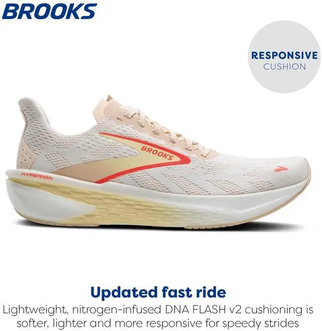 Designed to help you tap into that punchy, speedy feeling, the women's Hyperion 2 running shoes deliver more of our light, responsive cushion than before for more softness underfoot. The streamlined fit and breathable mesh upper work with the cushioning to offer a versatile, performance-ready shoe.