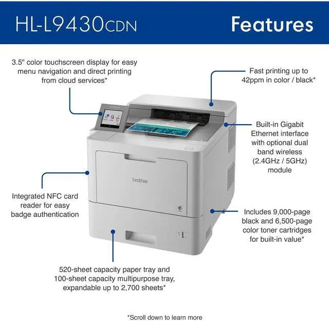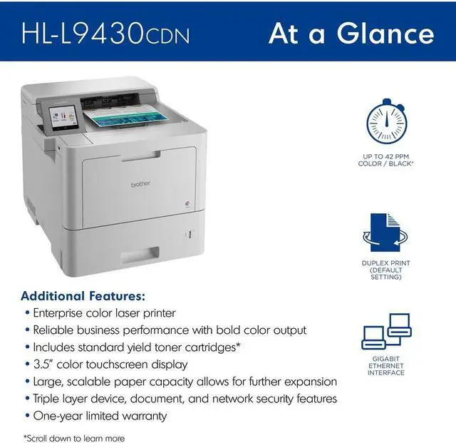 Brother Workhorse HL-L9430CDN Enterprise Color Laser Printer - - 42 ppm Mono/42 ppm Color Print - 2400 x 600 dpi class - 3.5" LCD Touchscreen - Gigabit Ethernet - Hi-Speed USB 2.0