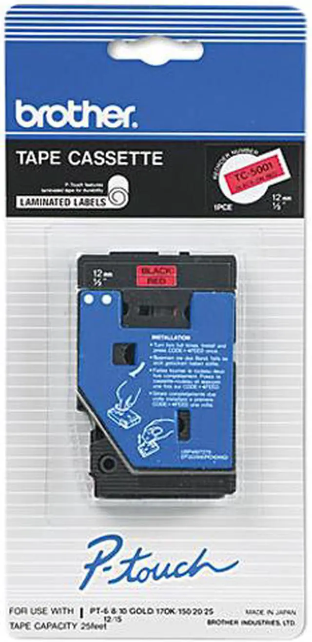Brother TC-5001 P-touch Laminated Tape, 12.7mm (0.5") Black-On-Red Tape 7.62m (25') - 1 Each