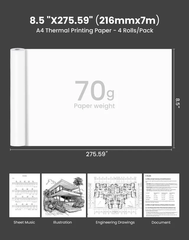 A4 Thermal Printer Paper: The package includes: 4 rolls of thermal paper 8.5x11, width 216mm, total length 9 meters. One roll is can print 27 sheets of 8.5 x 11 inch US letter size thermal printing paper