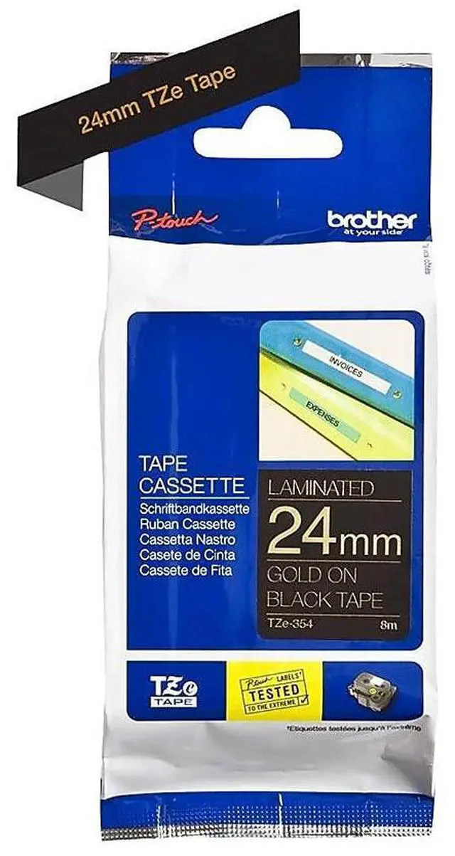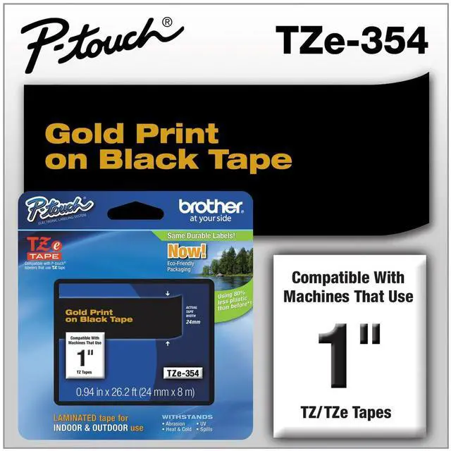Perfect for labeling file folders and binders, name badges, and small signage. Laminated surface wipes clean. Withstands water, grease, grime, fading and abrasion. Label Size - text: 1" x 26 1/5 ft.; Label Color(s): Black; Machine Compatibility: Brother P-Touch® PT-1400, PT-1500, PT-1500PC, PT-1600, PT-1900, PT-1910, PT-1950, PT-2110, PT-2200, PT-2210, PT-2300, PT-2310, PT-2400, PT-2410, PT-2430PC, PT-2500PC, PT-2600, PT-2610, PT-2700, PT-2710, PT-2730, PT-2730VP, PT-330, PT-350, PT-3600, PT-520, PT-530, PT-540, PT-550, PT-580C, PT-7500, PT-9200DX, PT-9200PC, PT-9400, PT-9500PC, PT-9600, PT-9700PC, PT-9800PCN, PT-D600, PT-D600VP, PT-E500, PT-E550W, PT-H500LI, PT-P700, PT-P750W, PT-P750WVP, PT-P900W, PT-P950NW; Printed Text Color(s): Gold.
