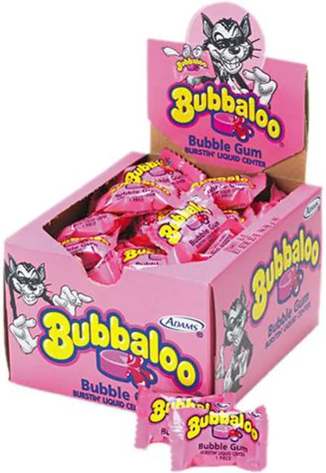 Bubbaloo bubble gum features a refreshing liquid center. Each piece is individually wrapped for a convenient treat on the go. The convenient dispenser box sits easily on countertops and desks to offer the individually wrapped pieces of gum to visitors and co-workers.