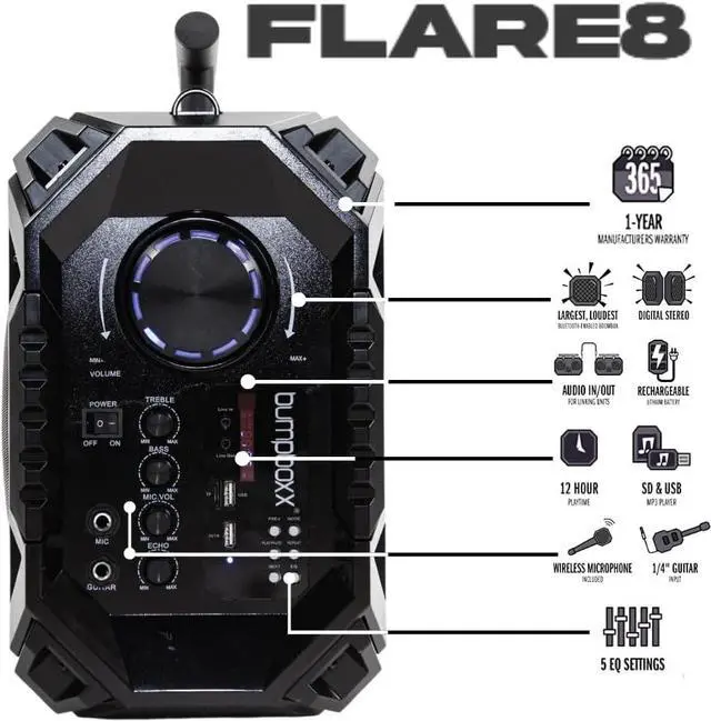 The Flare8 is a step up from our Flare6 model. This unit has larger woofers and 200 watts of TRUE power. This is perfect for those seeking deeper bass to go along with crystal clear music. The Flare8 doubles as a guitar amp and includes a wireless microphone.