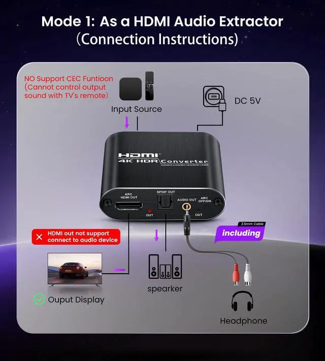 HDMI Audio Extractor: Support one HDMI input source to one HDMI output + optical toslink SPDIF and analog 3.5mm stereo audio output. (Tips: SPDIF and 3.5mm audio support output separately to soundbar, amplifier, headphone and other audio receiver without connecting TV / Monitor)