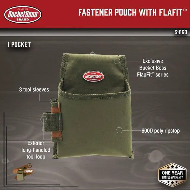California Proposition 65: This product contains a chemical known to the State of California to cause birth defects or other reproductive harm. When you need to keep your tools close at hand, the Bucket Boss 54160 Green Polyester 1 Pockets is a great option. It has a spacious main compartment and an exterior tool pouch for storing smaller items. Made of polyester, this green tool belt and pouch is built to last. The large main compartment has a durable YKK zipper closure for security. You can fit your belt up to 2 in. wide through the belt loops on either side of the pouch. There are also D rings on each side of the open top pocket for easy access to your tools when working overhead or from awkward angles. With its sturdy construction and multiple storage options, this Bucket Boss 54160 Green Polyester 1 Pockets will meet all your needs while keeping you organized.
