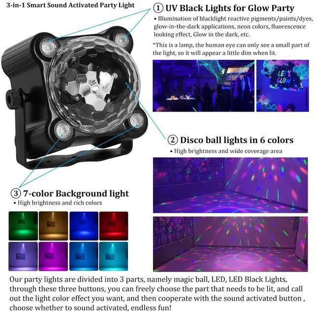 The disco ball party light is ideal for disco, birthday party, black lights for glow party bar, KTV, club dance hall, concert, ballroom, Christmas, Halloween, Home, Pool Party, ice rink, gym, barbecue party.