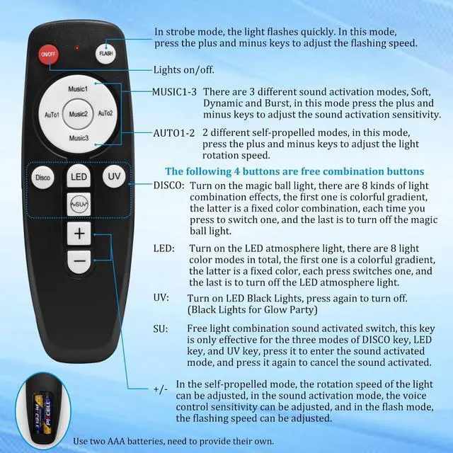 - Lighting modes can be switched using the remote control: automatic, strobe and sound-activated modes, as well as light-on-demand modes.