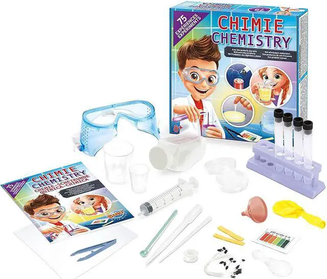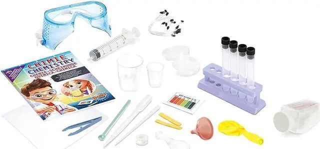 A chemistry set with 75 safe, chemical-free experiments! Perform fun scientific experiments with common household products like salt, vinegar and flour. Which has the most acidic pH out of water and orange juice? How do clouds form? How can you make a heavy object float? Instruction sheet with color illustrations.