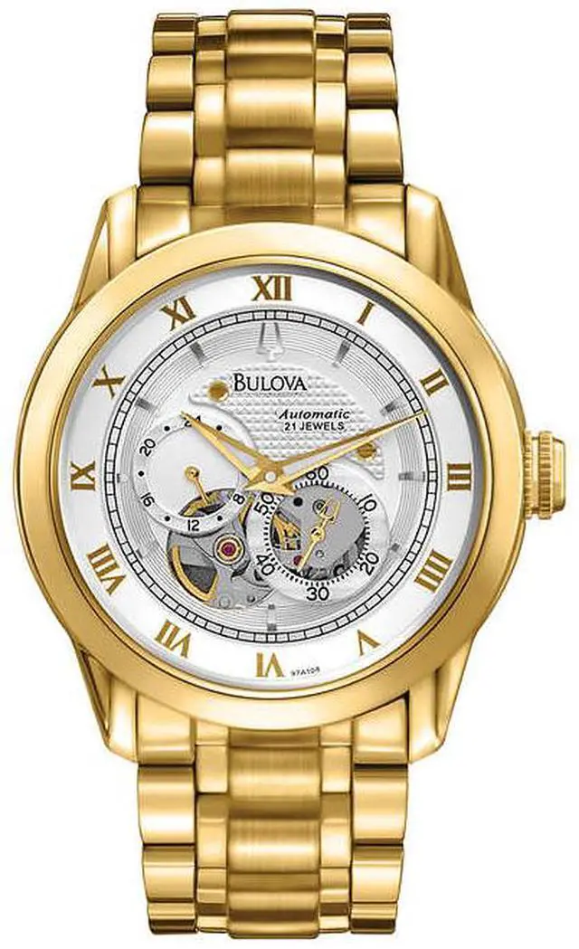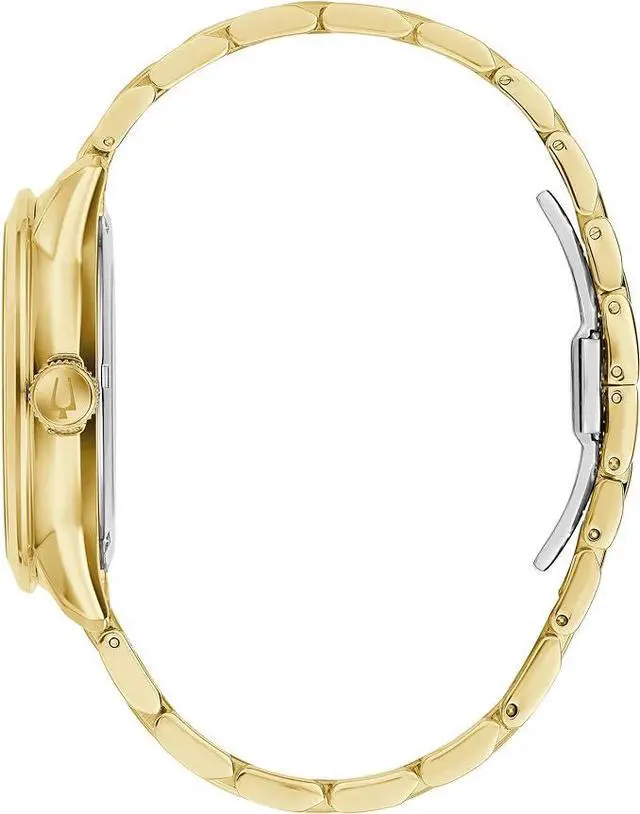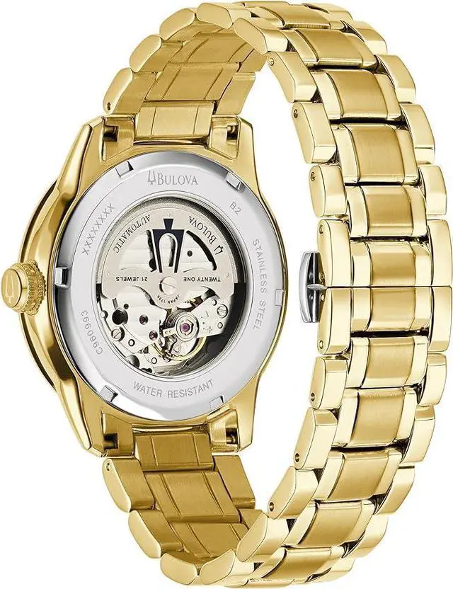 The Bulova Classic Sutton Automatic Mens Watch elevates timeless elegance with impeccable craftsmanship. This 42mm timepiece features a gold-tone stainless steel case with a screw-down caseback and a sophisticated skeleton dial showcasing a textured design and the intricate automatic movement. Protected by a mineral crystal it is paired with a gold-tone stainless steel link bracelet secured by a fold-over push-button deployment clasp for refined comfort. With a band length adjustable from 195mm to 240mm and water resistance up to 30 meters this watch blends style and precision for the modern gentleman. Case Size- 42mm. Dial Color- Skeleton.