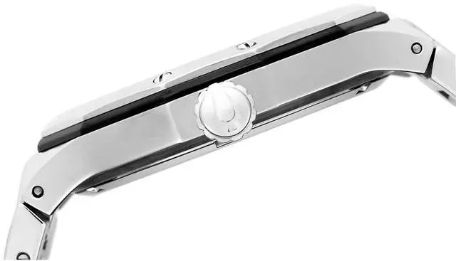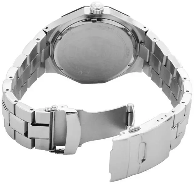 Stainless steel case. Stainless steel bracelet. Black dial. Quartz movement. Mineral crystal. Date. Water resistant 100 meters. Case 44mm.