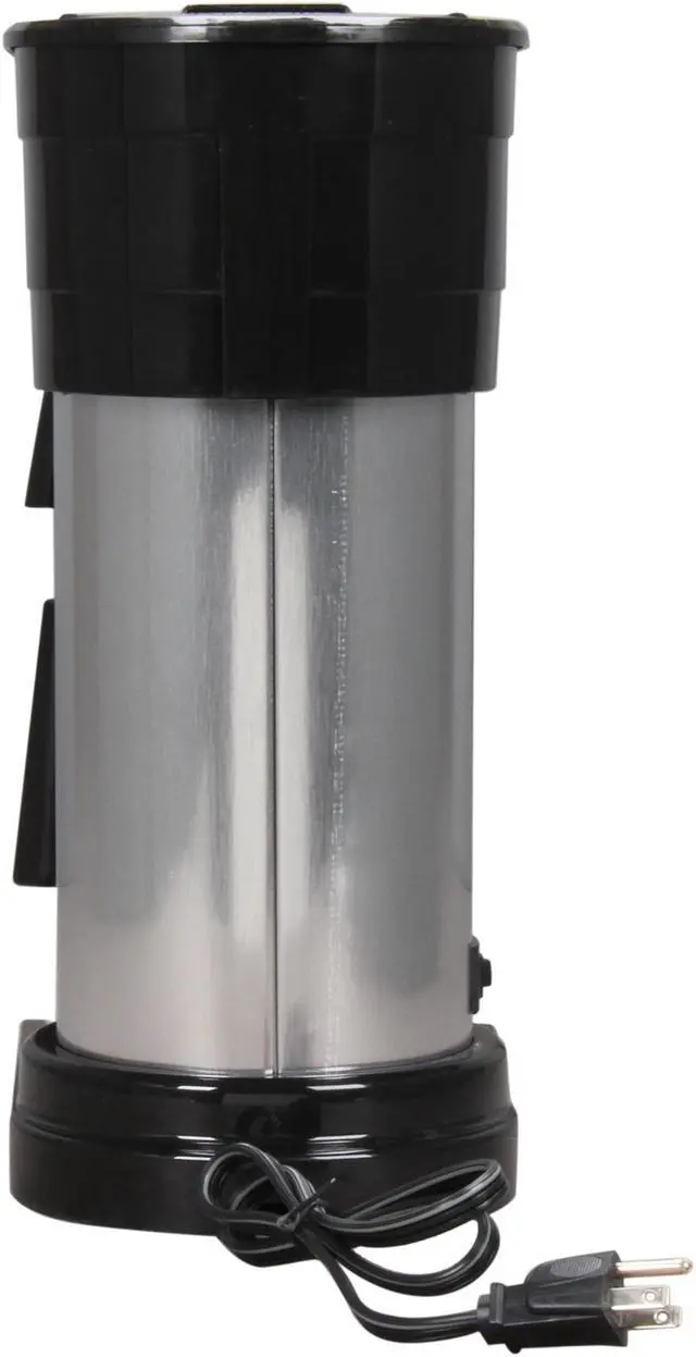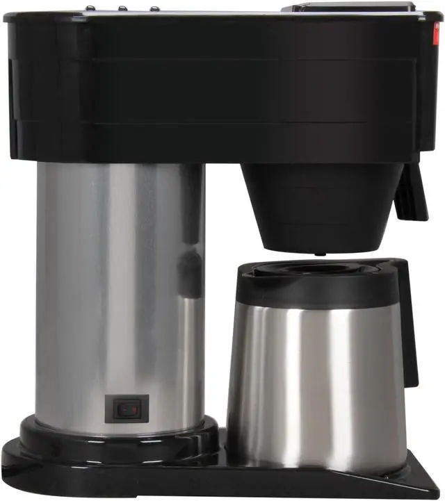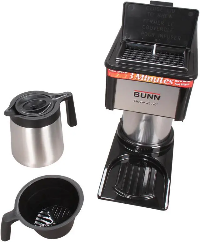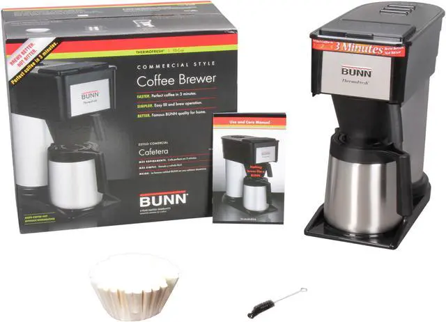 BUNN 10-cup Thermofresh Home Brewer - 900 W - 10 Cup(s) - Multi-serve - Black, Silver - Stainless Steel 10-cup Thermofresh Home Brewer offers a stainless steel vacuum-insulated carafe that keeps coffee hot without overheating. Brew 10 cups of perfect coffee in 3 minutes. Internal thermostat keeps water at ideal brewing temperature. Patented sprayhead design improves coffee flavor extraction. Unbreakable double-wall carafe is dishwasher-safe and includes a convenient close-and-brew lid. Home brewer requires no warmer, keeping hot water available in the 800 watt tank heater (900 watts total). Vacation switch turns tank heat off. Home Brewer includes 10-cup carafe, coffee funnel, deliming spring and filters. UL listed.