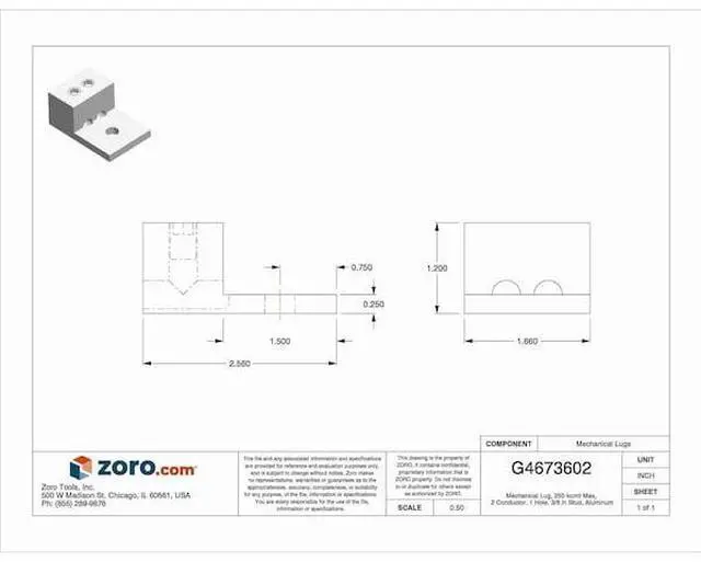 Mechanical Connector, For Conductor Material Aluminum, Copper, For Stranded Copper Wire Size - Minimum 6 AWG, For Stranded Copper Wire Size - Maximum 250 kcmil, For Stud Size 3/8 in, Head Style Slotted, Number of Holes 1, Hole Diameter 0.4 in, Hole Spacing Not Applicable, Body Material Aluminum, Maximum Operating Temperature 194 Degrees F, Maximum Voltage 600 V, Number of Conductors 2, Number of Terminations 2, Tongue Length 1.5 in, Tongue Width 1.66 in, Tongue Thickness 0.25 in. This item has been restricted from sale in the following state (s): []