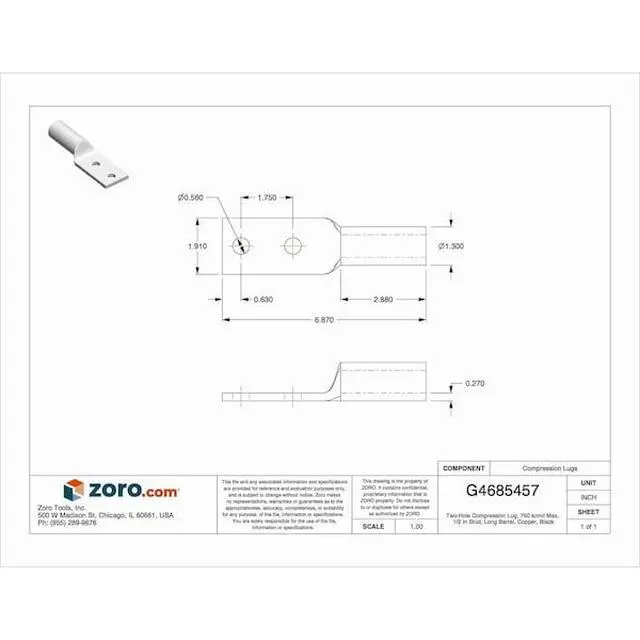 Compression Lug, Barrel Size Long, Color Code Black, Die Code 24, Tongue Angle Straight, Tongue Width 1.91 in, For Conductor Material Copper, For Stud Size 1/2 in, For Stranded Copper Wire Size - Minimum 750 kcmil, For Stranded Copper Wire Size - Maximum 750 kcmil, Inspection Hole No, Hole Center to Center 1.75 in, Material Copper, Maximum Operating Temperature 194 Degrees F, Maximum Voltage 35 kV, Termination Style Crimp, Standards CSA Certified, UL 486A-486B, UL Listed, Number of Holes 2.