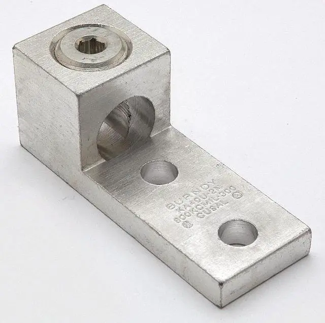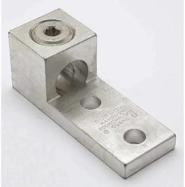 Wire Connector, For Conductor Material Aluminum, Copper, For Stranded Copper Wire Size - Minimum 300 kcmil, For Stranded Copper Wire Size - Maximum 800 kcmil, For Stud Size 1/2 in, Head Style Hex, Number of Holes 2, Hole Diameter 0.56 in, Hole Spacing 1.75 in, Body Material Aluminum, Maximum Temperature 194 Degrees F, Maximum Voltage 600 V, Number of Conductors 1, Number of Terminations 1, Tongue Length 3.03 in, Tongue Width 1.77 in, Tongue Thickness 0.5 in, Connector Type Lug. This item has been restricted from sale in the following state (s): []