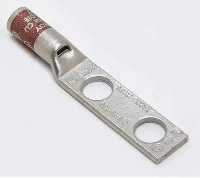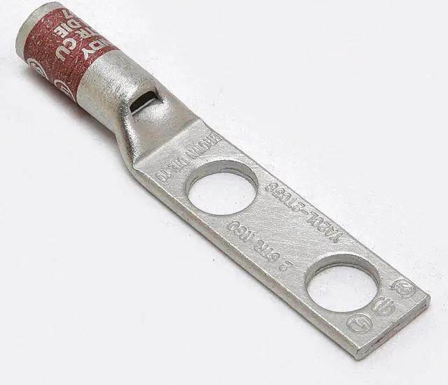 Two-Hole Lug Compression Connector, Barrel Size Standard, Color Code Brown, Die Code 10, Tongue Angle Straight, Tongue Width 0.6 in, For Conductor Material Copper, For Stud Size 3/8 in, For Stranded Copper Wire Size - Minimum 2 AWG, For Stranded Copper Wire Size - Maximum 2 AWG, Inspection Hole Yes, Hole Center to Center 1 in, Material Copper, Maximum Operating Temperature 194 Degrees F, Maximum Voltage 35 kV AC, Termination Style Crimp, Standards CSA Certified, UL 486A-486B, UL Listed