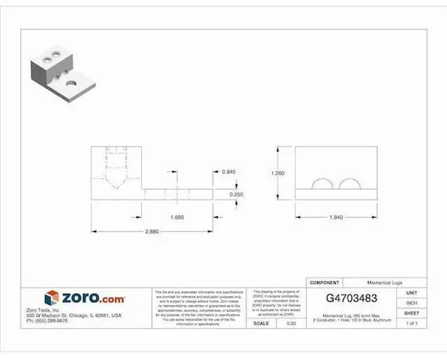 Mechanical Connector, For Conductor Material Aluminum, Copper, For Stranded Copper Wire Size - Minimum 6 AWG, For Stranded Copper Wire Size - Maximum 350 kcmil, For Stud Size 1/2 in, Head Style Slotted, Number of Holes 1, Hole Diameter 0.56 in, Hole Spacing Not Applicable, Body Material Aluminum, Maximum Operating Temperature 194 Degrees F, Maximum Voltage 600 V, Number of Conductors 2, Number of Terminations 2, Tongue Length 1.69 in, Tongue Width 1.94 in, Tongue Thickness 0.25 in. This item has been restricted from sale in the following state (s): []