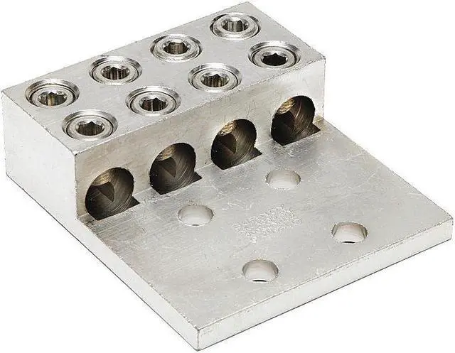 Mechanical Connector, For Conductor Material Aluminum, Copper, For Stranded Copper Wire Size - Minimum 2 AWG, For Stranded Copper Wire Size - Maximum 600 kcmil, For Stud Size 1/2 in, Head Style Hex Socket, Number of Holes 4, Hole Diameter 0.56 in, Hole Spacing 1.75 in, Body Material Aluminum, Maximum Temperature 194 Degrees F, Maximum Voltage 600 V, Number of Conductors 4, Number of Terminations 8, Tongue Length 3.34 in, Tongue Width 5 in, Tongue Thickness 0.44 in, Connector Type Terminal.