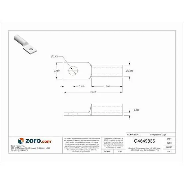 One-Hole Lug Compression Connector, Barrel Size Long, Color Code Pink, Die Code 12, 348, Tongue Angle Straight, Tongue Width 0.75 in, For Conductor Material Copper, For Stud Size 3/8 in, For Stranded Copper Wire Size - Minimum 1/0 AWG, For Stranded Copper Wire Size - Maximum 1/0 AWG, Inspection Hole No, Hole Center to Center Not Applicable, Material Copper, Maximum Operating Temperature 194 Degrees F, Maximum Voltage 35 kV AC, Termination Style Crimp. This item has been restricted from sale in the following state (s): []