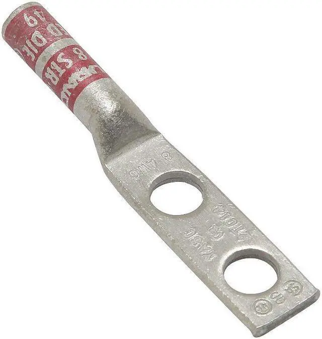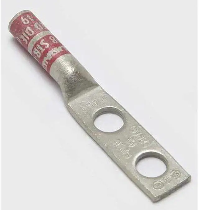 Compression Lug, Barrel Size Long, Color Code Red, Die Code 49, Tongue Angle Straight, Tongue Width 0.44 in, For Conductor Material Copper, For Stud Size 1/4 in, For Stranded Copper Wire Size - Minimum 8 AWG, For Stranded Copper Wire Size - Maximum 8 AWG, Inspection Hole No, Hole Center to Center 0.625 in, Material Copper, Maximum Operating Temperature 194 Degrees F, Maximum Voltage 35 kV, Termination Style Crimp, Standards CSA Certified, UL 486A-486B, UL Listed, Number of Holes 2.