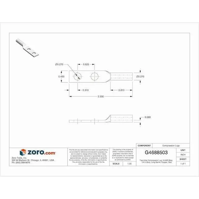 Compression Lug, Barrel Size Long, Color Code Red, Die Code 49, Tongue Angle Straight, Tongue Width 0.44 in, For Conductor Material Copper, For Stud Size 1/4 in, For Stranded Copper Wire Size - Minimum 8 AWG, For Stranded Copper Wire Size - Maximum 8 AWG, Inspection Hole No, Hole Center to Center 0.625 in, Material Copper, Maximum Operating Temperature 194 Degrees F, Maximum Voltage 35 kV, Termination Style Crimp, Standards CSA Certified, UL 486A-486B, UL Listed, Number of Holes 2.