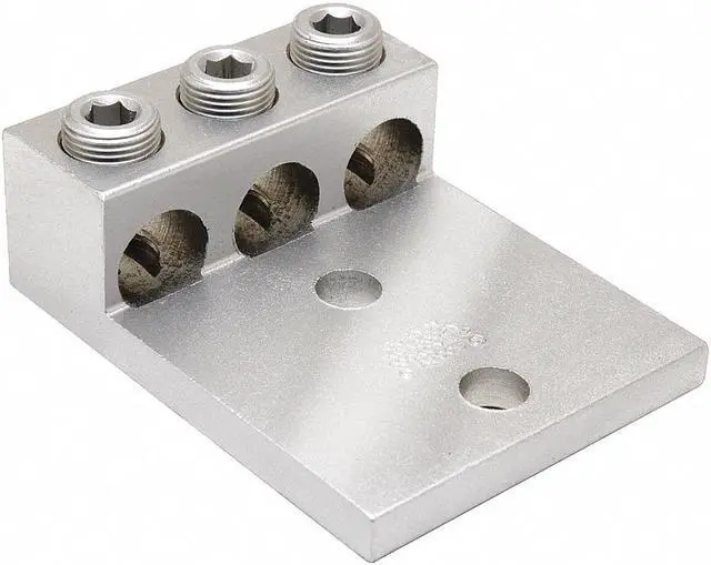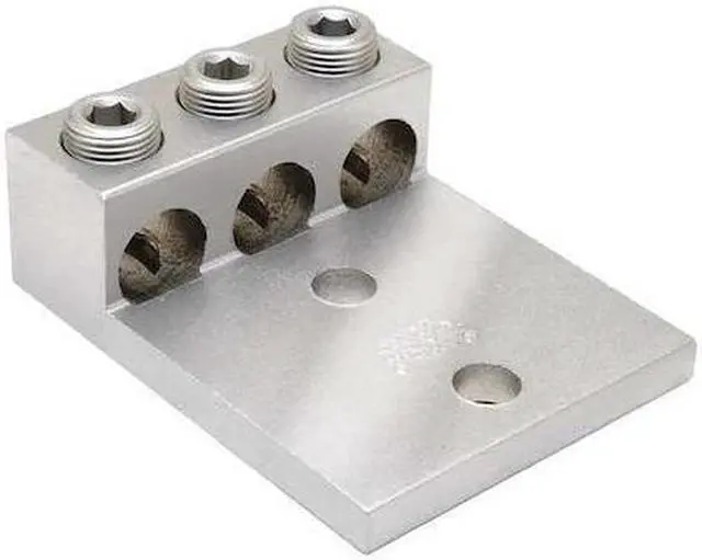 Mechanical Connector, For Conductor Material Aluminum, Copper, For Stranded Copper Wire Size - Minimum 14 AWG, For Stranded Copper Wire Size - Maximum 1/0 AWG, For Stud Size 3/8 in, Head Style Slotted, Number of Holes 2, Hole Diameter 0.45 in, Hole Spacing 1 in, Body Material Aluminum, Maximum Temperature 194 Degrees F, Maximum Voltage 600 V, Number of Conductors 3, Number of Terminations 3, Tongue Length 2.09 in, Tongue Width 1.94 in, Tongue Thickness 0.25 in, Connector Type Terminal. This item has been restricted from sale in the following state (s): []