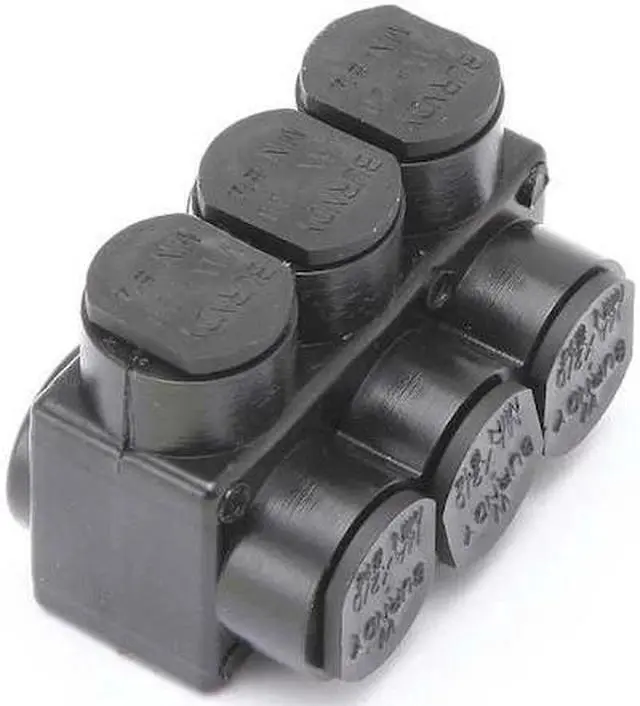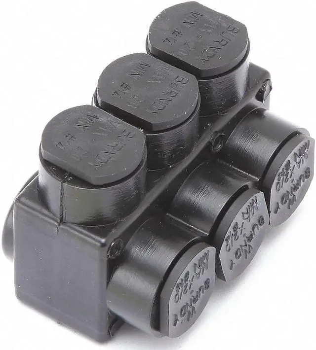 Insulated Multitap Connector, Body Material Aluminum, Color Black, Finish Unplated, For Conductor Material Aluminum, Copper, For Stranded Copper Wire Size - Minimum 14 AWG, For Stranded Copper Wire Size - Maximum 2/0 AWG, Head Style Hex, Hex Size 3/16 in, Insulation Material Plastisol, Maximum Operating Temperature 194 Degrees F, Maximum Voltage 600 V, Mounting Hole Size Not Applicable, Number of Ports 3, RoHS Compliant Yes, Standards UL Listed, Compatible with Product Type Code Conductor. This item has been restricted from sale in the following state (s): []