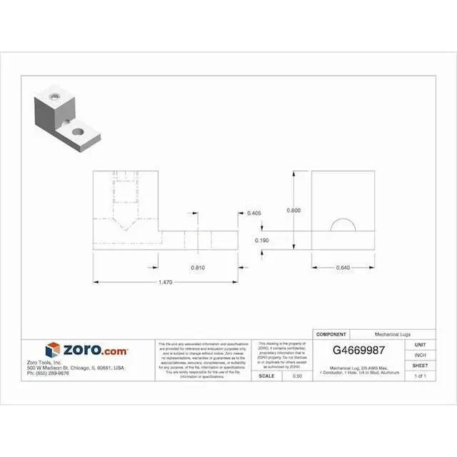 Mechanical Connector, For Conductor Material Aluminum, Copper, For Stranded Copper Wire Size - Minimum 14 AWG, For Stranded Copper Wire Size - Maximum 2/0 AWG, For Stud Size 1/4 in, Head Style Hex, Number of Holes 1, Hole Diameter 0.27 in, Hole Spacing Not Applicable, Body Material Aluminum, Maximum Operating Temperature 194 Degrees F, Maximum Voltage 600 V, Number of Conductors 1, Number of Terminations 1, Tongue Length 0.81 in, Tongue Width 0.64 in, Tongue Thickness 0.19 in, Connector Type Lug.