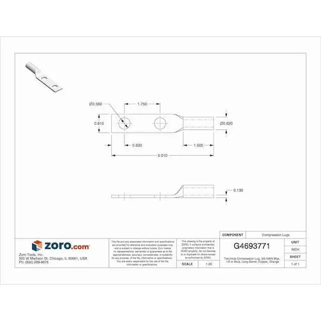Compression Lug, Barrel Size Long, Color Code Orange, Die Code 14, Tongue Angle Straight, Tongue Width 0.91 in, For Conductor Material Copper, For Stud Size 1/2 in, For Stranded Copper Wire Size - Minimum 3/0 AWG, For Stranded Copper Wire Size - Maximum 3/0 AWG, Inspection Hole No, Hole Center to Center 1.75 in, Material Copper, Maximum Operating Temperature 194 Degrees F, Maximum Voltage 35 kV, Termination Style Crimp, Standards CSA Certified, UL 486A-486B, UL Listed, Number of Holes 2.