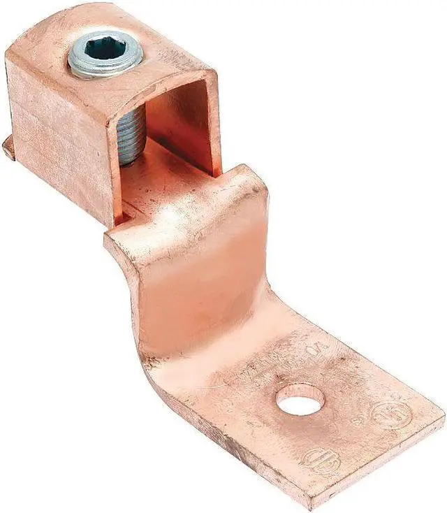 Mechanical Connector, For Conductor Material Copper, For Stranded Copper Wire Size - Minimum 8 AWG, For Stranded Copper Wire Size - Maximum 2 AWG, For Stud Size 1/4 in, Head Style Slotted, Number of Holes 1, Hole Diameter 0.26 in, Hole Spacing Not Applicable, Body Material Copper, Maximum Operating Temperature 194 Degrees F, Maximum Voltage 600 V, Number of Conductors 1, Number of Terminations 1, Tongue Length Not Applicable, Tongue Width 0.5 in, Tongue Thickness 0.08 in, Connector Type Terminal