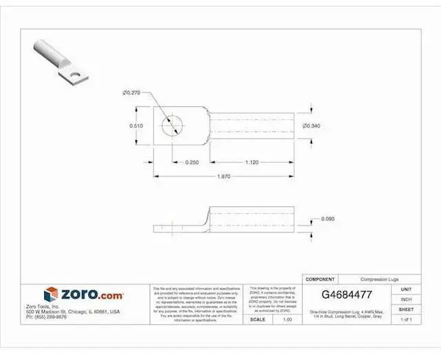 Compression Lug, Barrel Size Long, Color Code Gray, Die Code 346, 8, Tongue Angle Straight, Tongue Width 0.5 in, For Conductor Material Copper, For Stud Size 1/4 in, For Stranded Copper Wire Size - Minimum 4 AWG, For Stranded Copper Wire Size - Maximum 4 AWG, Inspection Hole No, Hole Center to Center Not Applicable, Material Copper, Maximum Temperature 194 Degrees F, Maximum Voltage 35 kV, Termination Style Crimp, Standards CSA Certified, UL 486A-486B, UL Listed, Number of Holes 1.