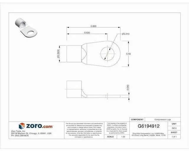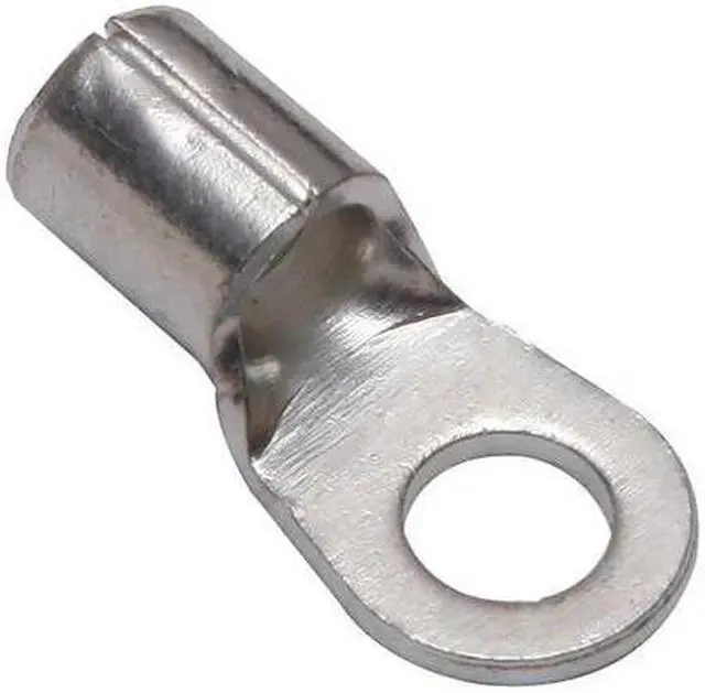 Ring Terminal, Insulation Color Bare, Insulation Coverage None, Insulation Material None, Maximum Operating Temperature 302 Degrees F, Maximum Voltage 600 V, Minimum Wire Size 8 AWG, Maximum Wire Size 8 AWG, Termination Style Crimp, Tongue Width 0.4 in, Contact Finish Tin, Contact Material Copper, Standards UL 467, Barrel Length 0.31 in, Barrel Outside Diameter 0.26 in, Barrel Size Long, Barrel Style Brazed, Compatible Grainger Part Number 22P158, 22P219, 22P221. This item has been restricted from sale in the following state (s): []