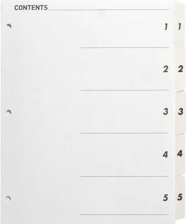 Make organization quick and easy using a black/white Table of Contents page that coordinates with included dividers with numbered tabs. Key in or type section titles and then print or copy onto the Table of Contents page preprinted with numbers that match the dividers. Edges and white tabs feature Mylar reinforcement to prevent tearing. Three-hole punched edges allow easy, quick placement into standard-size, three-ring binders. Index dividers are compatible with all laser and inkjet printers and include easy-to-follow instructions.