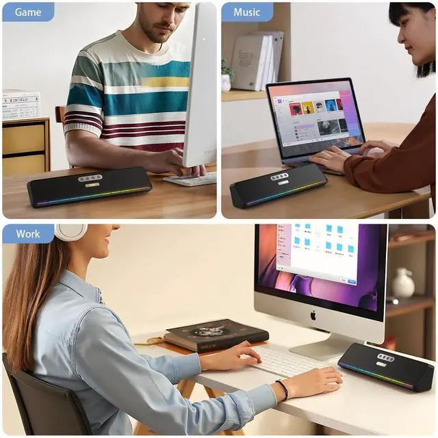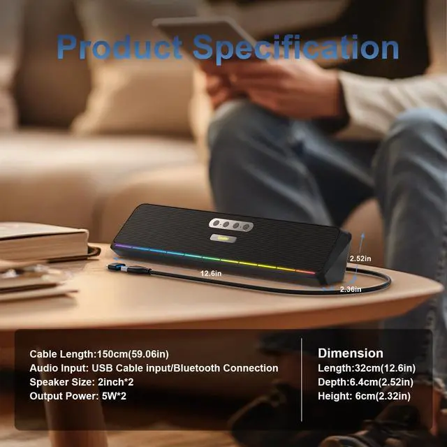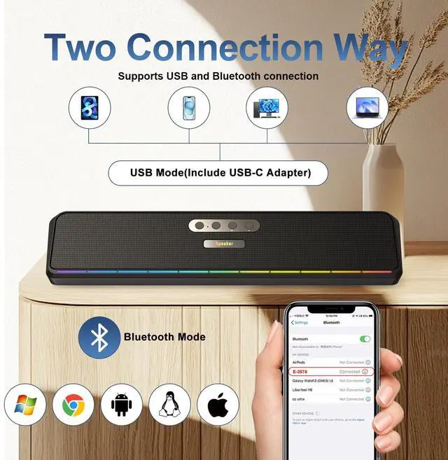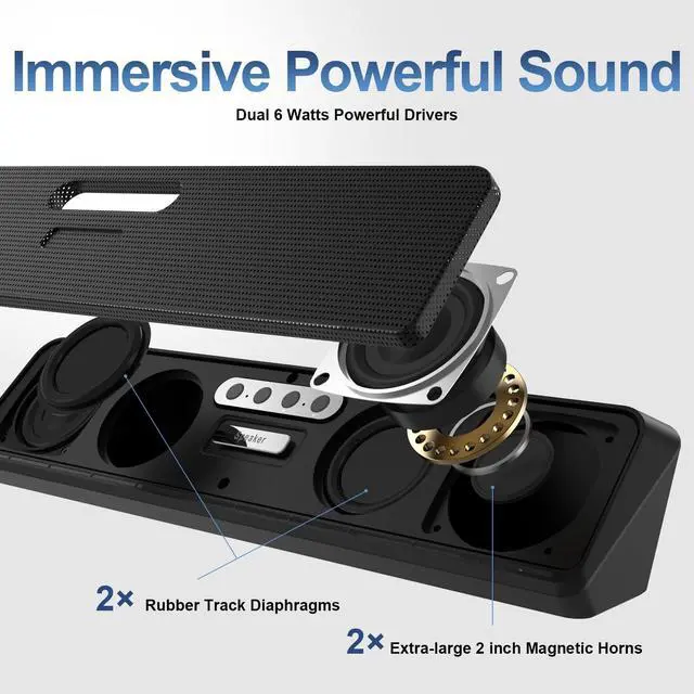 Computer Speakers for Desktop Laptop Tablet, Wired USB Mini Sound Bar Speaker with Stereo Sound, Vibrating Diaphragms, Flowing LED, Plug-n-Play PC Speakers Computer Sound Bar, Bluetooth & USB Input