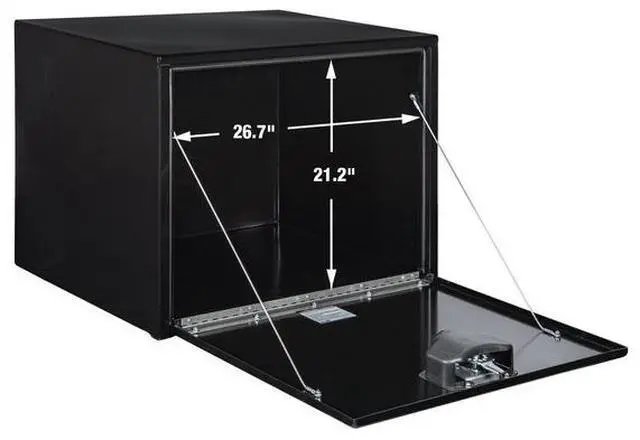 Underbody Truck Box, Gloss Black, Single Drop-Down Door, Overall Width 30 in, Overall Depth 24 in, Overall Height 24 in, Storage Capacity 10 cu ft, 14 ga Gauge, Mounting Style Bolt-On, Locking System Keyed, Latch Mechanism T-Handle, Includes Aircraft Cable Door Retainers, Stainless Steel Locking Rotary Paddle Latch, Body Material Steel, Cover Material Steel, Lid Type Non-Adjustable, Features Aircraft-Grade Cables and a Replaceable Gasket Sealing System, Locking Stainless Steel Compression Latch. This item has been restricted from sale in the following state (s): []