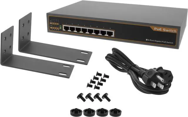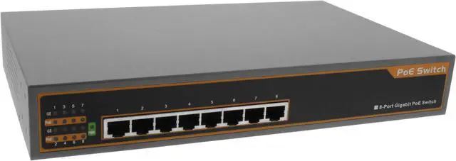 BV-SW800G is a 10/100/1000Mbps Ethernet switch with 8 PoE ports. At 130W of power, BV-SW800G is compliant with IEEE 802.3 af/at Standard by using 8 PoE Ports. BV-SW800G supplies data and Power over Ethernet (PoE) using a single Cat-5 cable (sold separately). All ports automatically detect devices, speed and cable type making setup quick and easy! The BV-SW800G is suitable for IP-based surveillance cameras, but will also work with VoIP phones and other devices that use PoE technology. Specifications Switch Type- Internal Power Standards- IEEE 802.3 af/at IEEE 802.3 10 BaseT IEEE 802.3 u 100 BaseTX IEEE 802.3 ab 1000 BaseT IEEE 802.3 x Flow Control Number of Ports- 8 PoE/PSE ports MAC Address- 1K Buffer Memory- 512 bits Transmission Method- Store and Forward Transmission Media- 10 BaseT CAT 3, 4, 5 UTP/STP 100M BaseTx CAT 5 UTP/STP 1000M BaseTx CAT 5, 6 UTP/STP LED Indicators Per Port- Link/Act, PoE Act/Status LED Indicators Per Unit- Power Power Input- 100~240V/AC, 50~60 Hz Power Output - 44-57V/DC Power Consumption - 15-30W per port, 130W Max Operating Temperature- 32ºF ~ 140ºF (0ºC ~ 60ºC) Storage Temperature- -4ºF ~ 194ºF (-20ºC ~ 90ºC) Humidity- 10 ~ 90% (Non-Condensing)