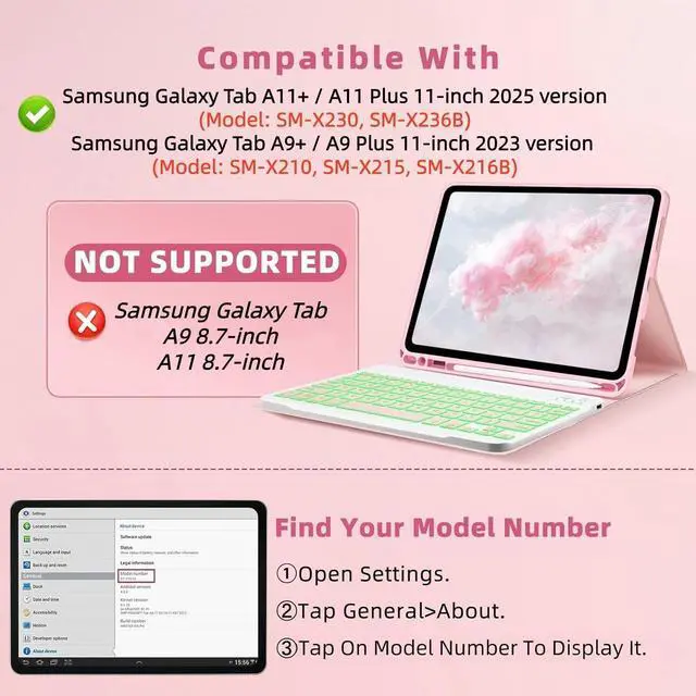 Compatible ModelsThis keyboard case is compatible with Samsung Galaxy Tab A11+ / A11 Plus 11-inch 2025 version (Model: SM-X230, SM-X236B); compatible with Samsung Galaxy Tab A9+ / A9 Plus 11-inch 2023 version (Model: SM-X210, SM-X215, SM-X216B). Note: Please check whether your for Galaxy Tab tablet model is compatible before purchasing. (Click "Settings-System-About Tablet Model")