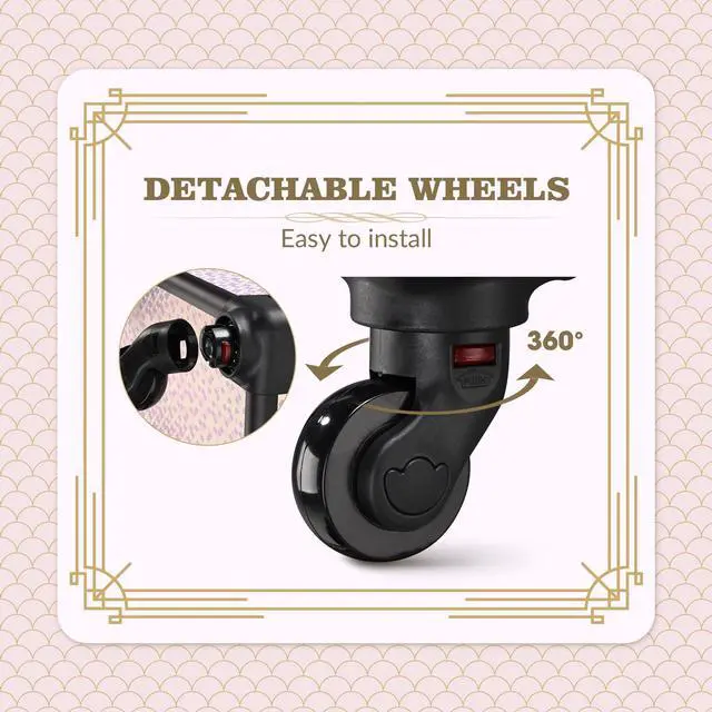 - Cosmetology Case on Wheels - 360-degree rotating, detachable wheels offer superior maneuverability and quiet transport. Navigate bustling backstage areas and crowded airports with graceful ease. Simply press the buttons and detach the wheels for compact storage and replacement