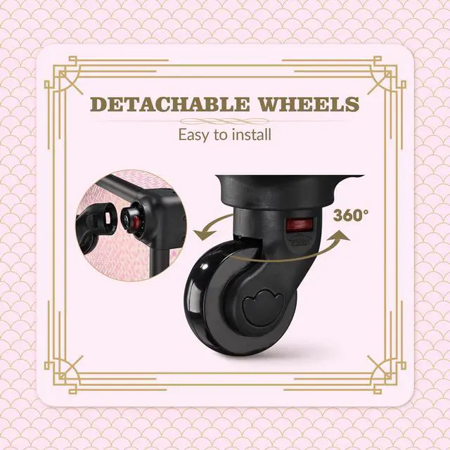 - Cosmetology Case on Wheels - 360-degree rotating, detachable wheels offer superior maneuverability and quiet transport. Navigate bustling backstage areas and crowded airports with graceful ease. Simply press the buttons and detach the wheels for compact storage and replacement