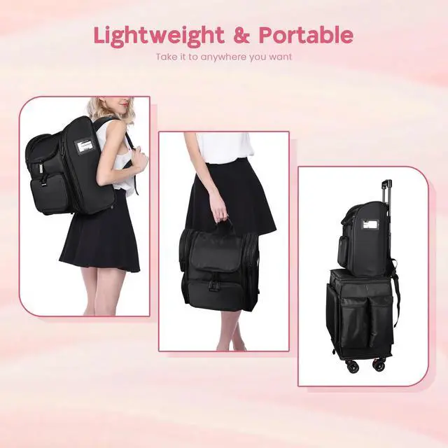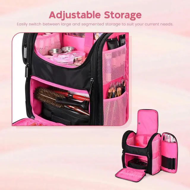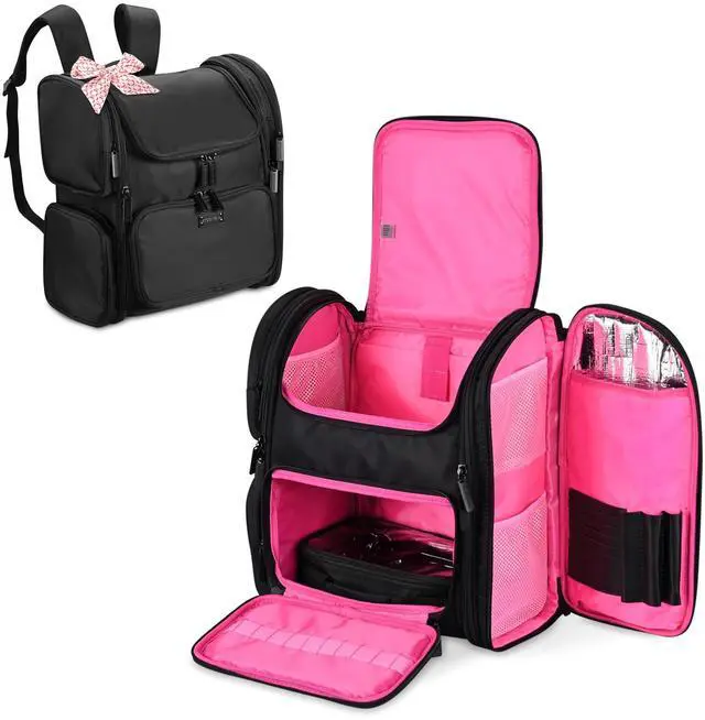 - Eye-catching & Portable - 15 3/16" x 8 11/16" x 15 3/4" Byootique Makeup Backpack features black surface with eye-catching pink liner for a stylish and unique look; Equipped with adjustable shoulder straps for easy carrying and a back strap for fixing the bag on the telescoping handle of train case, great for on-the-go makeup artists or bloggers who need to carry a lot of cosmetics