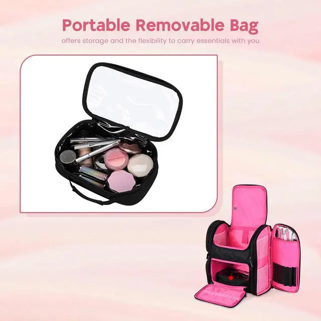 - Customizable Storage - Features a large compartment with unfixed divider moving up-and-down, enabling it to turn into 1 or 2 storage layers for versatile storage, along with 2 small side pockets on the left, 1 large pocket on the right and 1 additional removable bag, helping you to store and organize your various cosmetics in a neat and orderly fashion