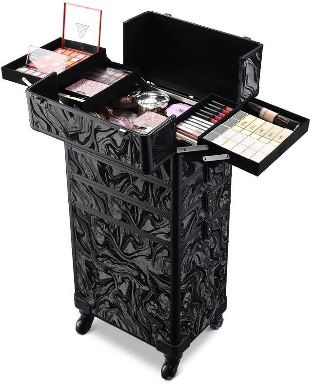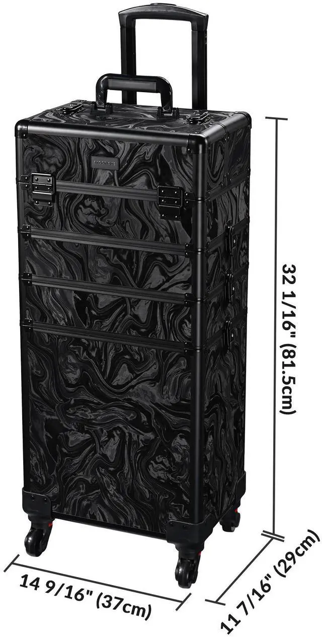 - Large Capacity - Middle Sized Rolling Makeup Train Case features 4 extendable trays on the top layer, open to display all your trending collection of cosmetics or nail polishes, along with 12" x 8" x 12" large storage space on the bottom for large bottles, hair dryers, hair sprays and more