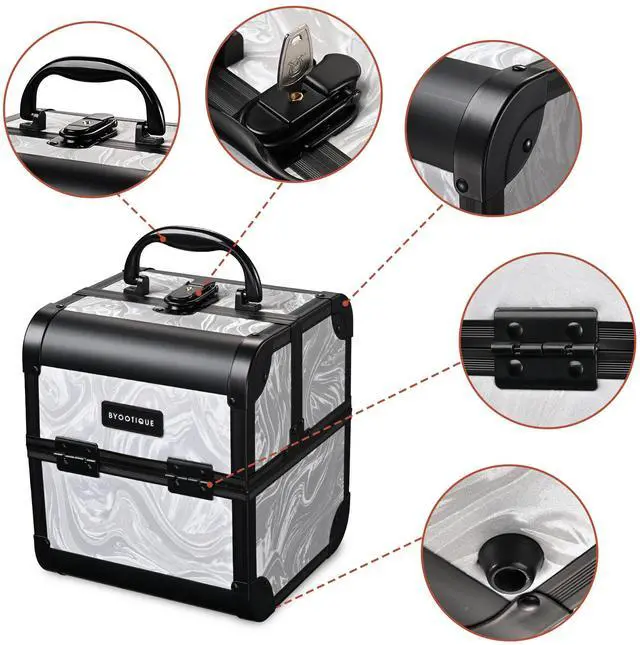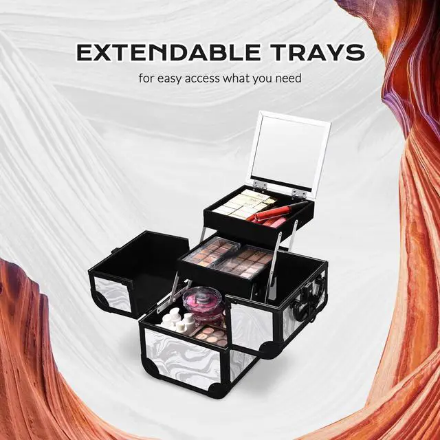 - Cube Case - Open the case to reveal a flip-up mirror and 2 extendable trays for organizing your makeup essentials such as lipsticks, compressed powders, and nail polishes, along with a bottom space for storing small bottles