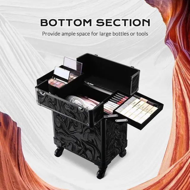 - Makeup Storage Solution - Rolling Makeup Train Case boasts 4 extendable trays on the top, open to display all your delicate cosmetics from lipsticks, eye palettes to nail polishes, and a spacious space underneath for extra storage of setting spray, hair stylers, hair dryers, and bottles