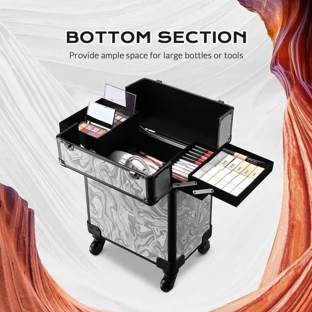 - Makeup Storage Solution - Rolling Makeup Train Case boasts 4 extendable trays on the top, open to display all your delicate cosmetics from lipsticks, eye palettes to nail polishes, and a spacious space underneath for extra storage of setting spray, hair stylers, hair dryers, and bottles