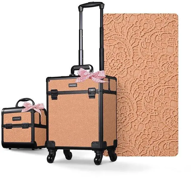 - 2-Piece Makeup Case Set - Byootique Kit includes 1 pcs rolling makeup case and 1 pcs handheld train case. Inspired by Rococo aesthetics, this set features embossed lush blossom and scrolls, meeting your needs for cosmetics storage while inspiring you to explore full potential of beauty