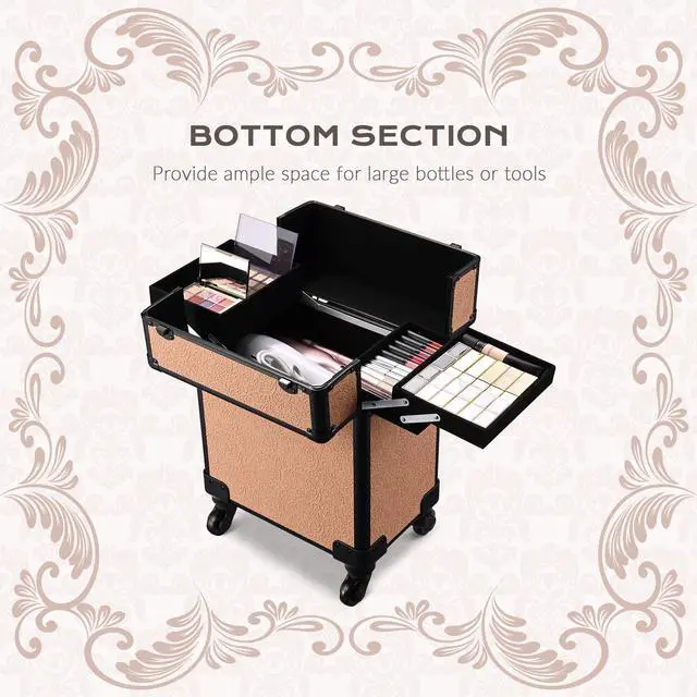 - Makeup Storage Solution - Rolling Makeup Train Case boasts 4 extendable trays on the top, open to display all your delicate cosmetics from lipsticks, eye palettes to nail polishes, and a spacious space underneath for extra storage of setting spray, hair stylers, hair dryers, and bottles